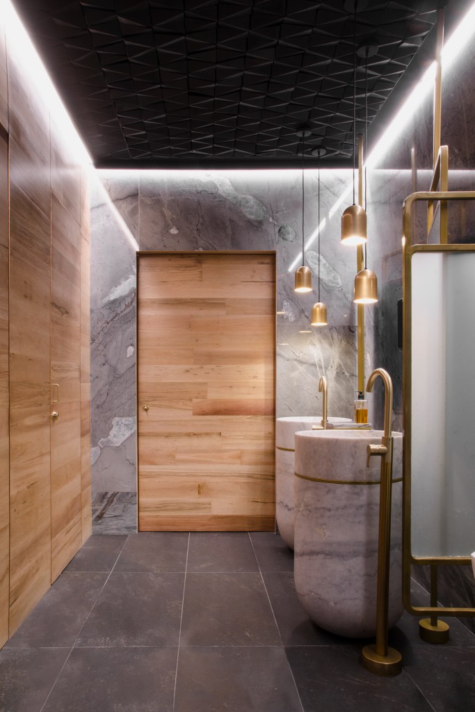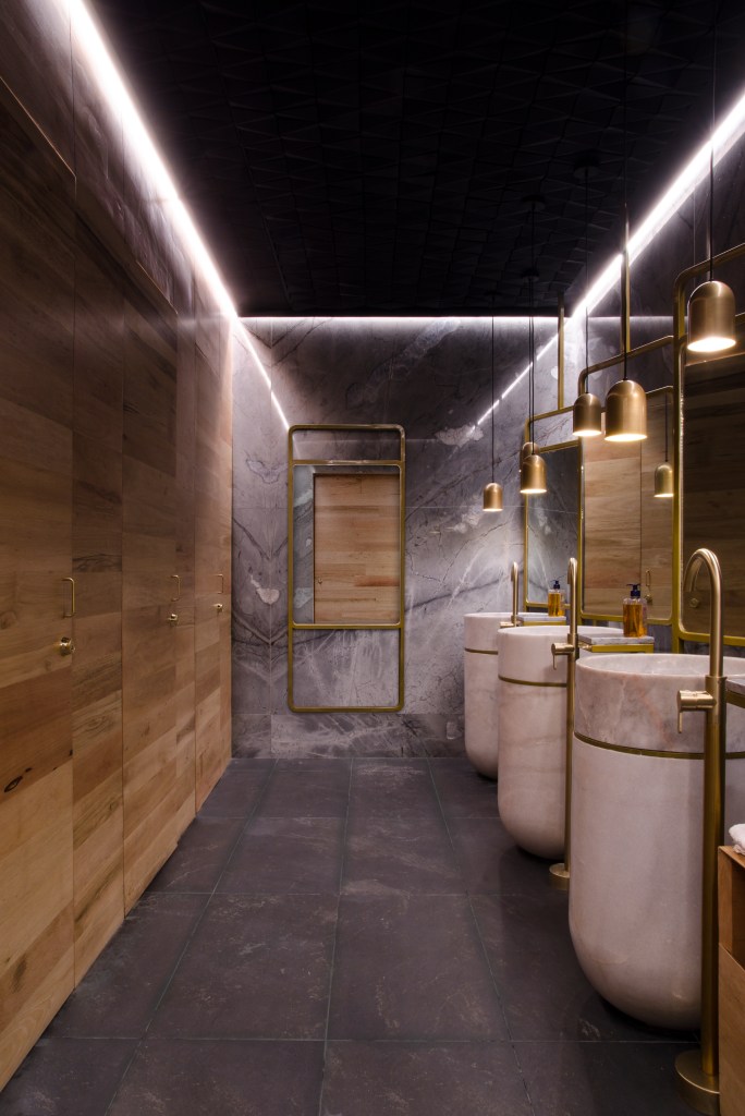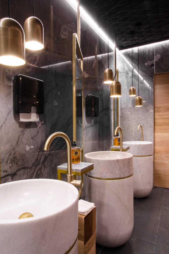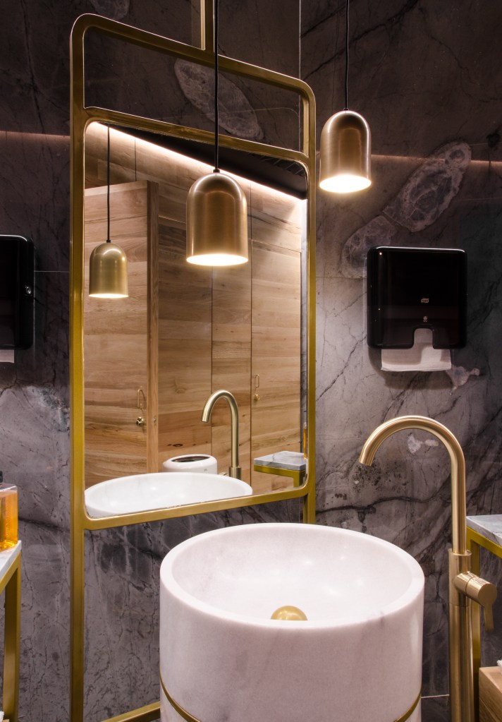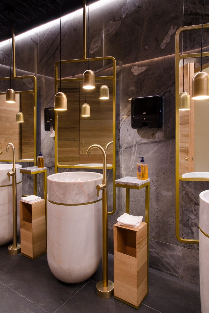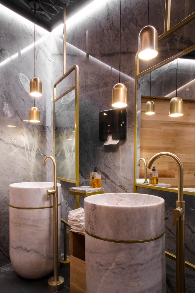 Los lavabos fabricados en el pueblo de Tecalli de Herrera, Puebla, sirvieron como punto de partida para el diseño, de manera que intentamos separar los elementos tanto de los muros de mármol, como entre ellos, provocando una sensación de protagonismo y ligereza en cada elemento.